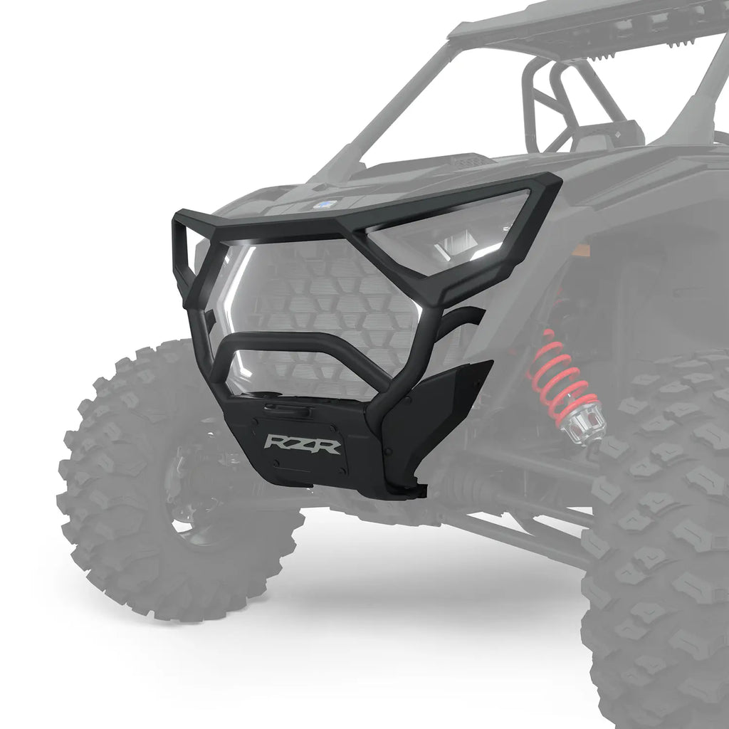 Upgrade your RZR with the Front High Coverage Bumper—a rugged and stylish addition that offers both utility and protection. This high coverage front bumper is designed to safeguard valuable components of your vehicle during off-road adventures, minimizing the risk of damage. Constructed with heavy-duty materials, it can withstand impact from obstacles like stumps and rocks. The tubular structure design and cast headlight bezels provide maximum coverage, while a built-in heavy-duty tow point ensures versatility on the trails. The bumper features a silk-screened RZR logo on the front cover plate to complement the aesthetics of your SxS. Designed for easy installation, this RZR front bumper utilizes direct-from-the-factory mounting points. All necessary mounting hardware is included. Choose from color-matched paint options to enhance the style of your RZR. Front plate is removed when bumper is used with a winch.